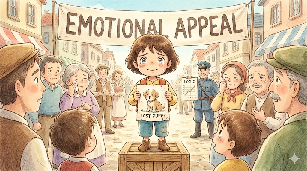 논리나 이성(Logic)보다는 동정심, 슬픔, 기쁨 같은 감정을 자극하여 사람을 설득하려는 전략입니다. 광고나 정치 연설에서 사람의 마음을 움직이기 위해 자주 사용됩니다.