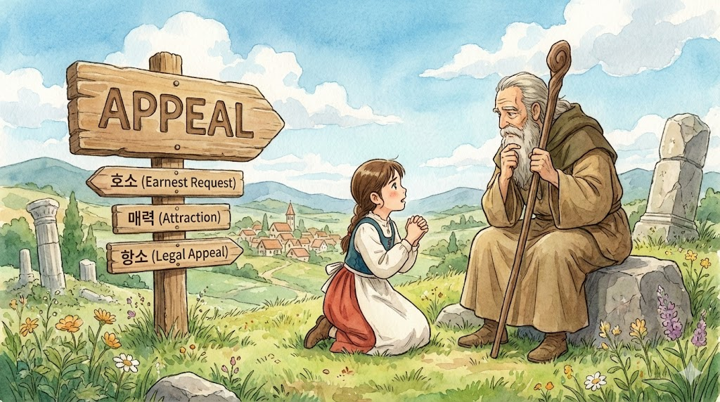 | 라틴어 appellare (말을 걸다/부르다) | "상대에게 다가가 호소함" | 간청/호소 (도움 요청) → 항소 (법적 도움 요청) → 매력 (마음을 끄는 힘) |