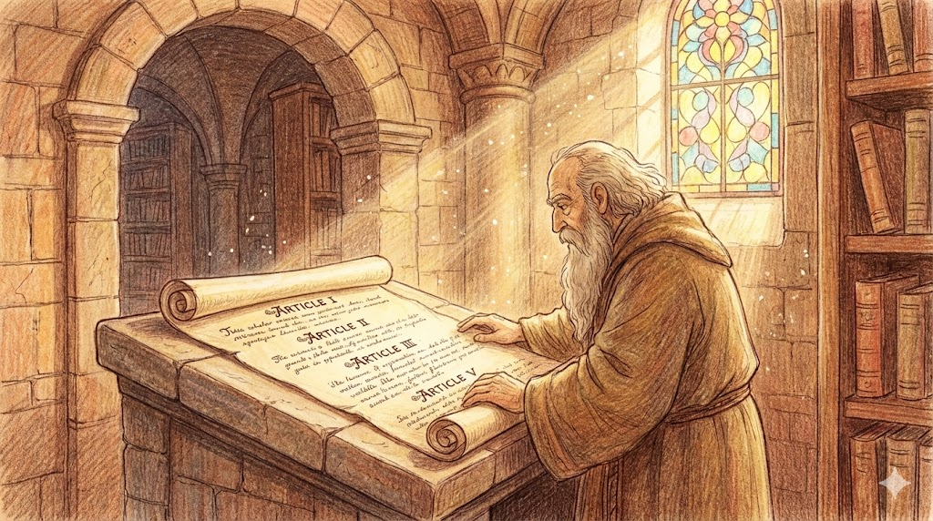 | 라틴어 articulus (작은 관절/마디) | "뚝 끊어진 작은 부분" | 조항 (법률의 마디) → 기사 (신문의 마디) → 물품 (물건의 낱개) → 관사 (문법의 작은 요소) |
