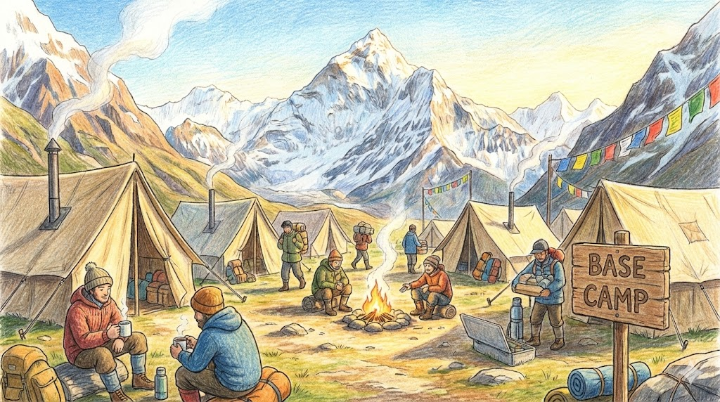 - 해석: 등산에서 정상 정복을 위한 출발 거점을 뜻하며, 비유적으로 어떤 활동의 중심이 되는 본부나 토대를 의미합니다.