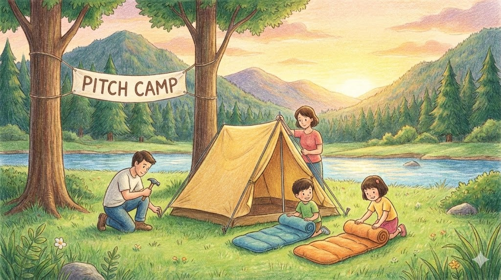 - Pitch a camp / Break camp. (텐트를 치다 / 야영을 철수하다.)