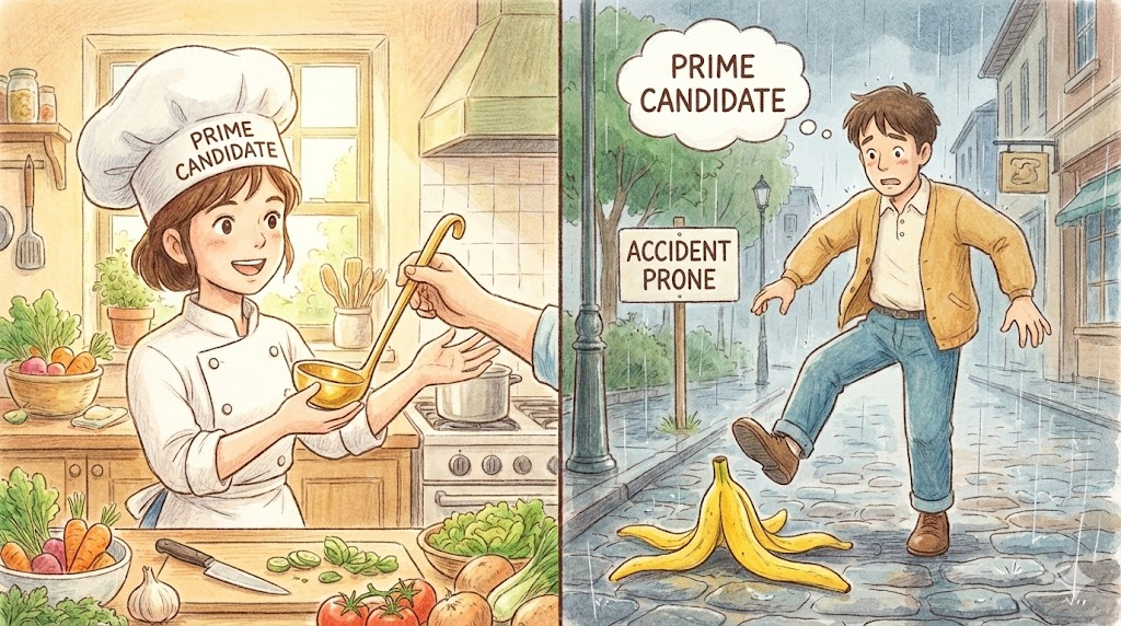 어떤 자리에 가장 적합한 훌륭한 사람을 뜻하기도 하지만, 비꼬는 말투나 부정적인 상황에서는 어떤 나쁜 일을 당하기 딱 좋은 상태인 사람(대상)을 말합니다. 예를 들어 "그는 심장마비 걸리기 딱 좋은 상태(Prime candidate)다"처럼 쓰입니다.