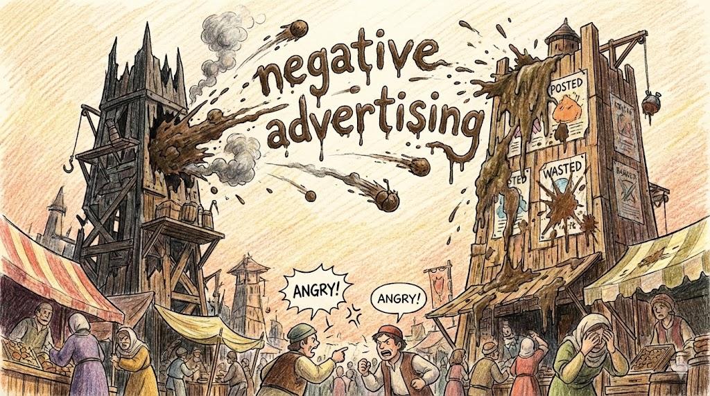 - 해석: 자기 장점을 알리기보다 경쟁 상대의 단점을 부각해 깍아내리는 광고 전략입니다. 주로 선거철에 많이 보입니다.