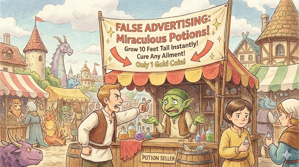제품의 성능이나 가격에 대해 사실과 다르게 거짓말을 하거나, 지나치게 부풀려서 소비자를 속이는 광고를 말합니다. "먹기만 하면 일주일에 10kg 감량" 같은 터무니없는 주장들이 이에 해당하며, 법적으로 처벌받을 수 있는 행위입니다.
