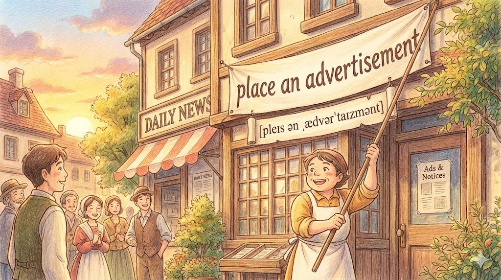 - 해석: 신문이나 웹사이트의 광고 지면을 사서 광고를 게시하는 행위입니다. (Put an advertisement라고도 함)