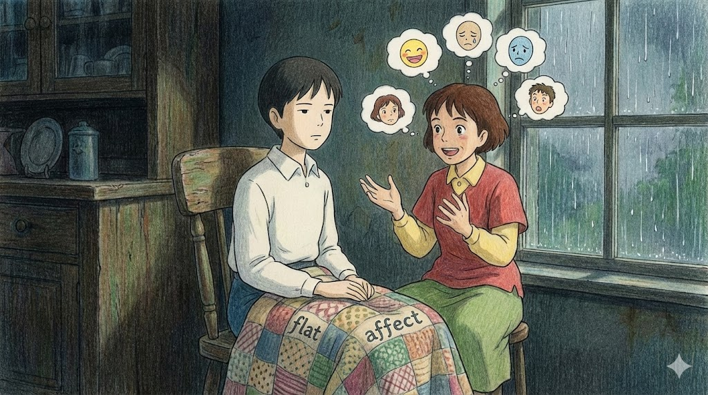 정신과나 심리학에서 쓰는 용어로, 슬픈 이야기를 하든 기쁜 이야기를 하든 얼굴 표정이나 목소리 톤에 아무런 감정이 드러나지 않는 상태를 말합니다. 우울증, 조현병, 혹은 극심한 충격 상태의 증상입니다.