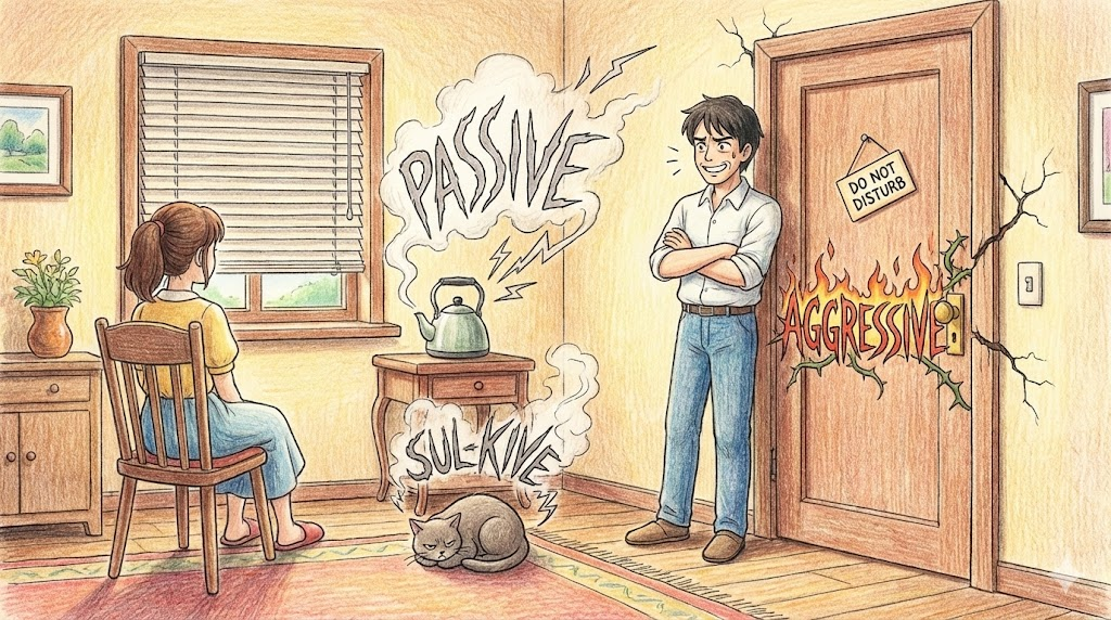 심경이나 성격을 묻는 문제에서 "Passive-aggressive" 가 나오면, 대놓고 화내는 것이 아니라 "비협조적이고 뒤틀린 태도" 를 의미합니다. 현대 사회의 인간관계 갈등을 묘사하는 핵심 키워드입니다.