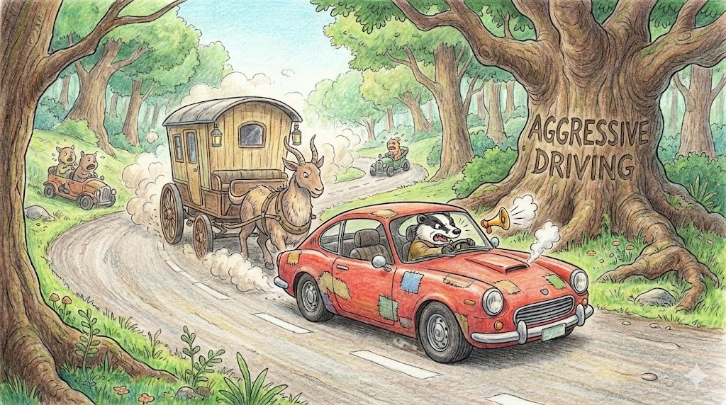 - 해석: 과속, 끼어들기, 위협 운전 등 도로 위에서의 위험한 행동입니다. (Road rage와 관련됨)