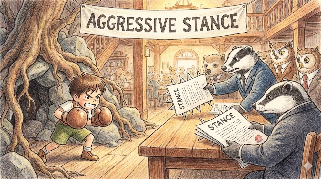 6. aggressive stance (강경한 태도/공세적인 입장)