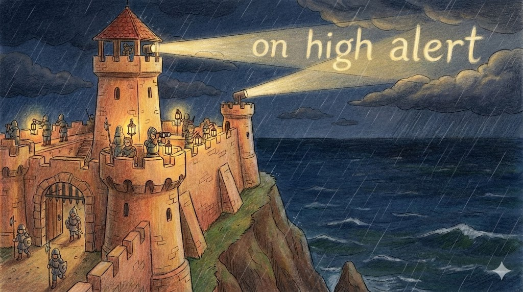 | 종합 뉘앙스 | (1) 적의 침입을 감시하기 위해 망루나 높은 곳에 서 있는 상태. (2) 높은 곳에서처럼 주위를 살피며 정신이 바짝 든 상태(기민한). (3) 위험을 알리는 신호(경보). | '높은 망루 위의 감시' |