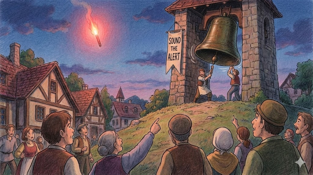 | 이탈리아어 all'erta (높은 곳에 서서) | "On the watch" | 경계하는 (파수꾼의 태도) → 기민한/초롱초롱한 (정신 상태) → 경보/알림 (위험 신호) → 알리다 (동사) |