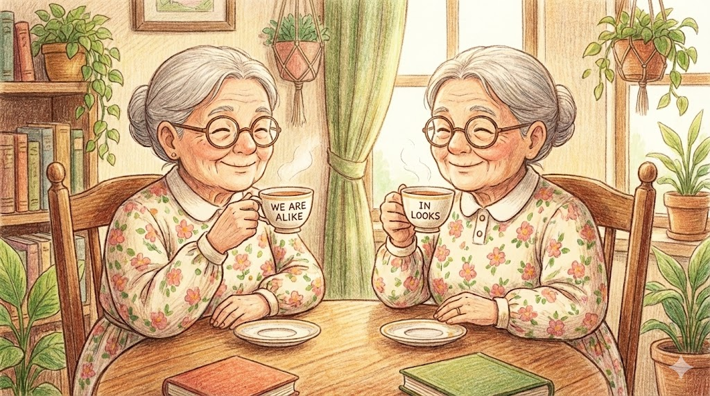 이 표현들은 'alike'가 외모뿐만 아니라 성격, 소리, 대우 방식에도 쓰임을 보여줍니다.