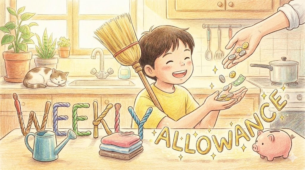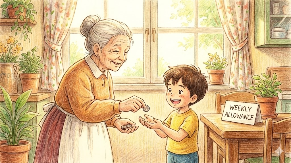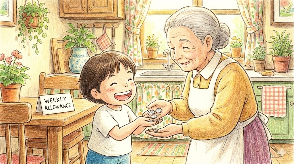 주로 어린이나 청소년들이 부모님께 일주일 단위로 받는 용돈을 말합니다. 경제 관념을 가르치기 위해 집안일을 돕는 대가로 주는 경우가 많습니다.