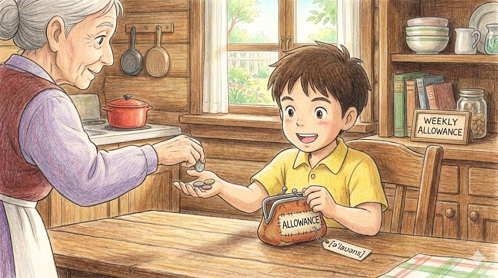 | 명사 (N.) | 용돈, 수당 | 정기적으로 지급되는 돈이나 특정 목적을 위한 보조금. | I give my son a weekly allowance. (나는 아들에게 매주 용돈을 준다.) |