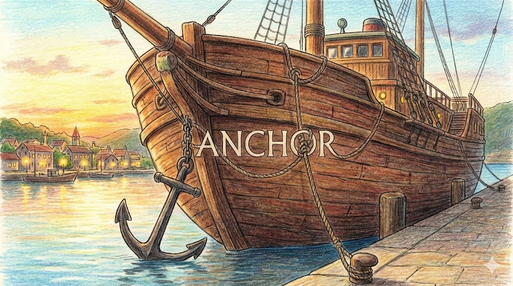 거친 파도 속에서도 배가 떠내려가지 않게 꽉 잡아주는 무거운 쇠덩어리(닻)입니다. 비유적으로는 불안한 상황에서 나를 흔들리지 않게 잡아주는 '정신적인 버팀목'이나 '믿을 수 있는 사람' 을 뜻할 때 아주 많이 씁니다.