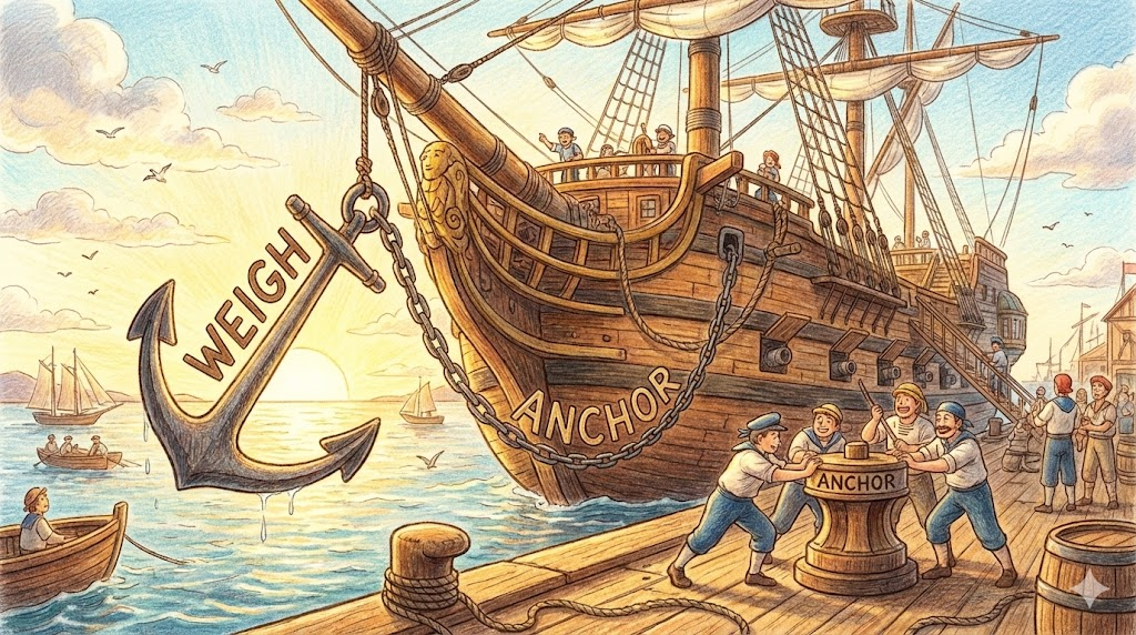 - 해석: 닻을 바닥에서 들어 올려 떠날 준비를 하는 것입니다. 여기서 'weigh'는 무게를 재다가 아니라 '들어 올리다(lift)'라는 고어적 의미입니다.