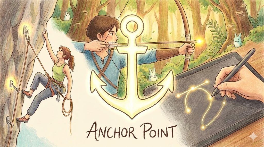 암벽 등반에서는 로프를 묶는 안전한 지점, 양궁에서는 활시위를 당길 때 손이 닿는 얼굴의 특정 지점, 그래픽 디자인(일러스트레이터 등)에서는 선과 선을 연결하는 점을 말합니다. 무언가를 지탱하거나 시작하는 '움직이지 않는 점' 입니다.