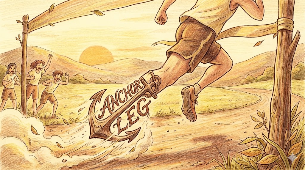 anchor leg는 이어달리기(릴레이)에서 승부를 결정짓는 가장 중요한 '마지막 주자(구간)' 를 뜻합니다.