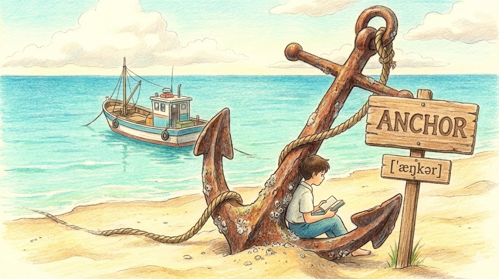 'anchor'는 배를 고정시키는 "닻" 을 뜻합니다. 여기서 파생되어 뉴스 프로그램을 진행하며 중심을 잡는 "앵커", 릴레이 경기의 "마지막 주자", 그리고 심리적으로 의지가 되는 "정신적 지주" 라는 뜻으로 확장됩니다.