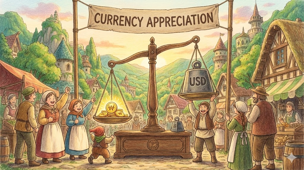 경제 뉴스에서 환율을 이야기할 때 필수적인 표현입니다. 다른 나라 돈에 비해 우리 돈의 힘(가치)이 세지는 것을 말합니다. 예를 들어, 1달러에 1300원 하던 것이 1100원이 되면 원화 가치가 상승(Appreciation)한 것입니다. 반대말은 'Depreciation(절하)'입니다.