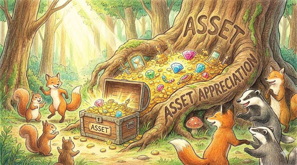 부동산, 주식, 금, 예술품 등 내가 가진 재산(Asset)의 가격이 시간이 지나면서 오르는 것을 말합니다. 투자의 주된 목적은 바로 이 '자산 증식(Appreciation)' 을 노리는 것입니다.