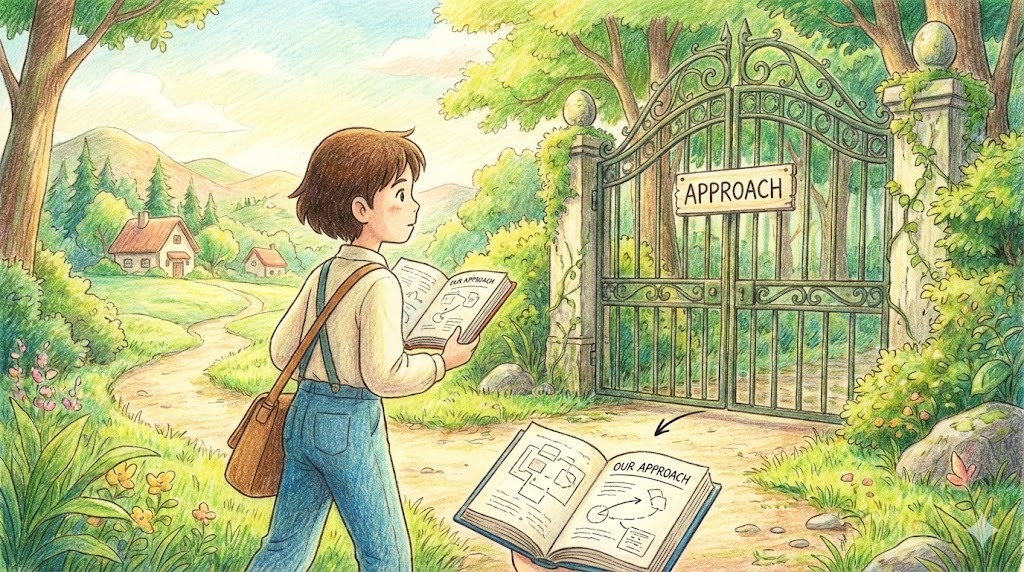 명사 'Approach' 뒤에는 전치사 'to' 가 짝꿍처럼 따라옵니다. 단순히 물리적으로 다가가는 것보다는, 특정 주제나 문제를 해결하기 위해 채택한 '방법론' 을 설명할 때 씁니다.