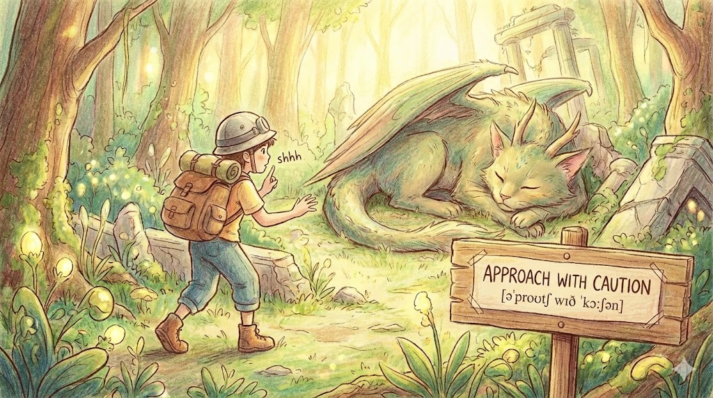 물리적으로 위험한 동물이나 물체에 다가갈 때도 쓰지만, 비즈니스나 인간관계에서 상황이 불안정하거나 민감하므로 섣불리 행동하지 말고 살피면서 천천히 다루라는 경고의 의미로 자주 쓰입니다.