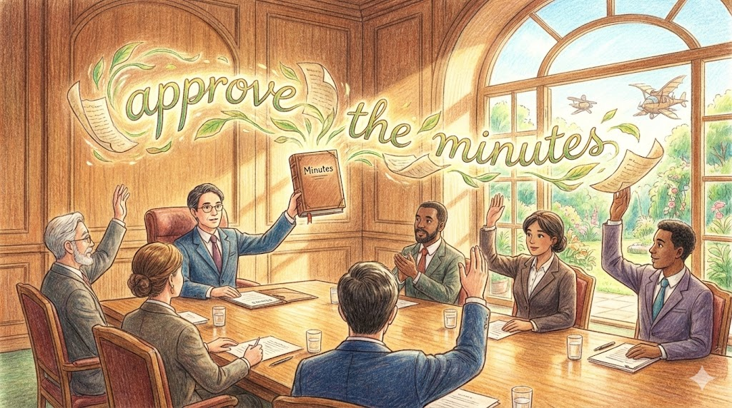 여기서 'Minutes'는 '분(시간)'이 아니라 '회의록' 을 뜻합니다. 다음 회의를 시작할 때, 지난번 회의 내용이 적힌 기록이 정확한지 확인하고 "네, 맞습니다" 하고 공식적으로 인정하는 절차를 말합니다. 비즈니스 회의의 필수 코스입니다.