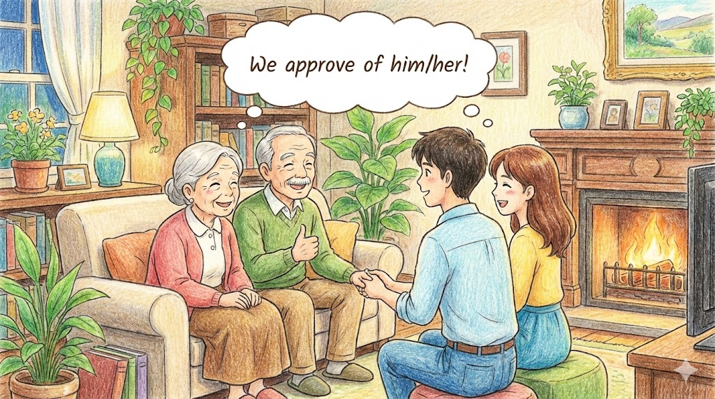 - 사적 상황: 부모님이 자식의 결혼 상대를 보거나, 친구의 행동을 보고 마음속으로 "음, 합격(괜찮네)!" 하고 받아들이는 느낌입니다. 이때는 주로 "Approve of" 를 씁니다.