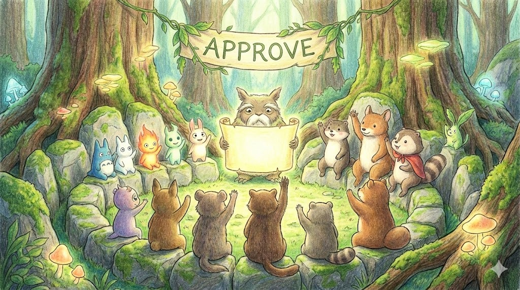 approve는 까다로운 심사 끝에 서류에 찍히는 '결재 도장' 이거나, 마음속의 심사를 통과한 상대에게 보내는 '긍정의 끄덕임' 입니다.