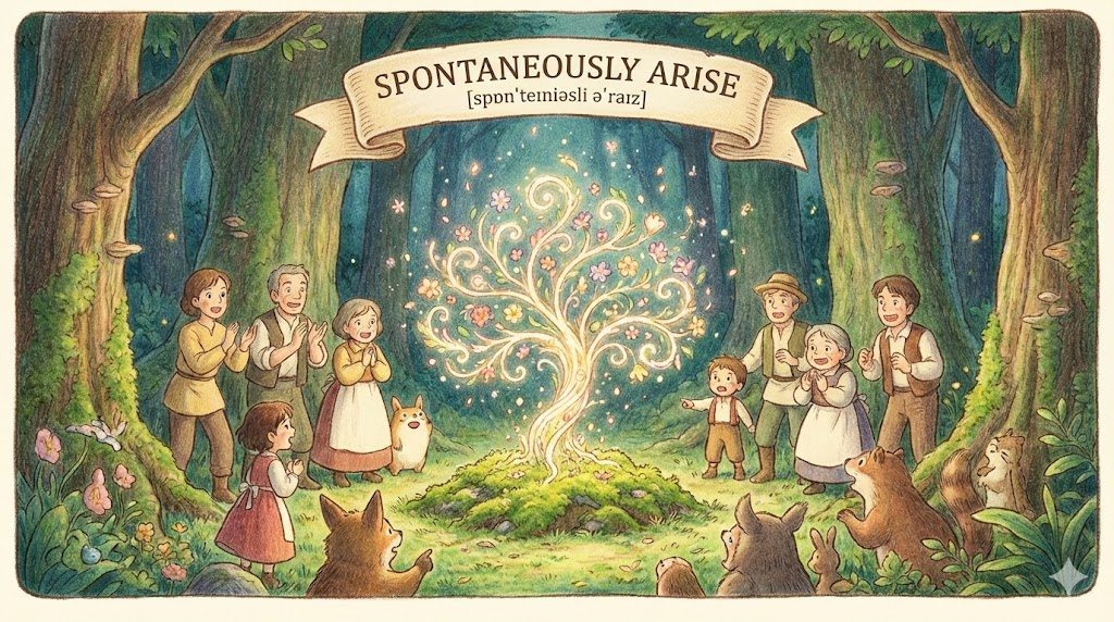 spontaneously arise는 외부의 강요나 원인 없이 '저절로(자연스럽게) 생겨나다' 는 뜻으로, 과학(자연 발생)이나 사회 현상(자발적 시위 등)에 쓰입니다.
