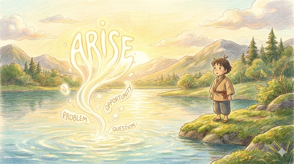 arise는 고요한 수면 위로 질문이나 문제가 불쑥 고개를 내미는 것처럼, 어떤 현상이 '생겨나는' 순간을 포착하는 단어입니다.