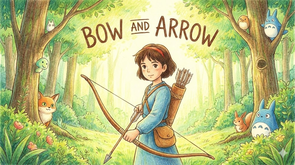 'arrow'는 화살입니다. 'bow and arrow'는 세트이며, 'shoot'으로 쏘고 'quiver'에 보관합니다. 비유적으로는 'straight as an arrow'(정직한), 'Time flies like an arrow'(쏜살같은 시간) 등으로 쓰입니다.