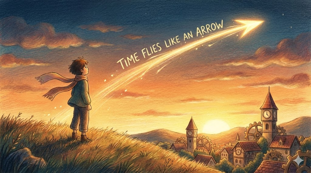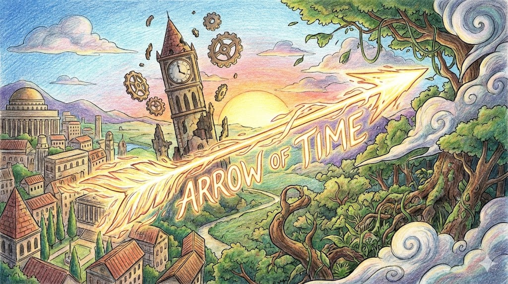 - 해석: (물리학/철학) 시간은 과거에서 미래로 한 방향으로만 흐르며 되돌릴 수 없다는 개념입니다. (엔트로피 법칙과 관련)