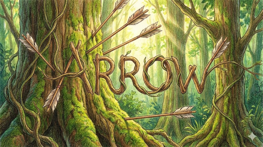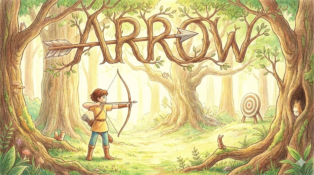 'arrow'는 무기로 쓰이는 "화살" 을 뜻하며, 방향을 가리키는 "화살표" 라는 기호로도 널리 쓰입니다. 속도, 방향성, 그리고 되돌릴 수 없는 시간의 흐름을 상징하는 중요한 단어입니다.