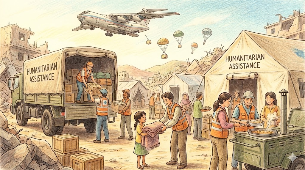 지진, 홍수 같은 자연재해나 전쟁으로 고통받는 사람들에게 생존에 필요한 식량, 물, 의약품 등을 긴급하게 보내주는 것입니다. 정치나 이념을 떠나 '인류애(Humanity)'를 바탕으로 돕는 활동을 말합니다.