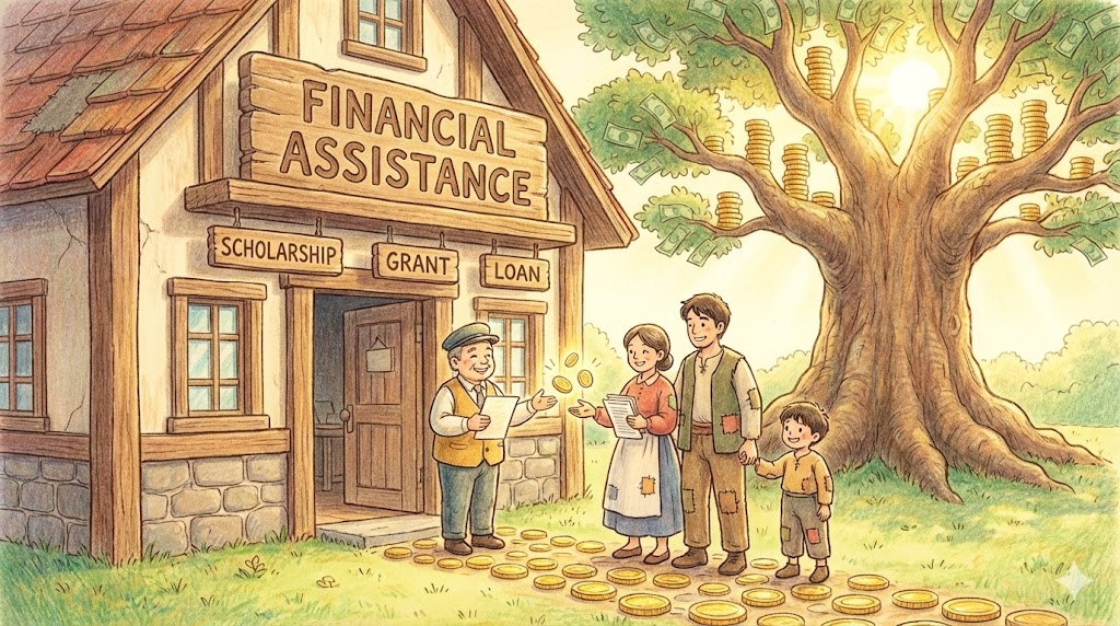 - 해석: 학비 보조금이나 정부 지원금 등 돈과 관련된 도움을 말합니다. (Financial aid)