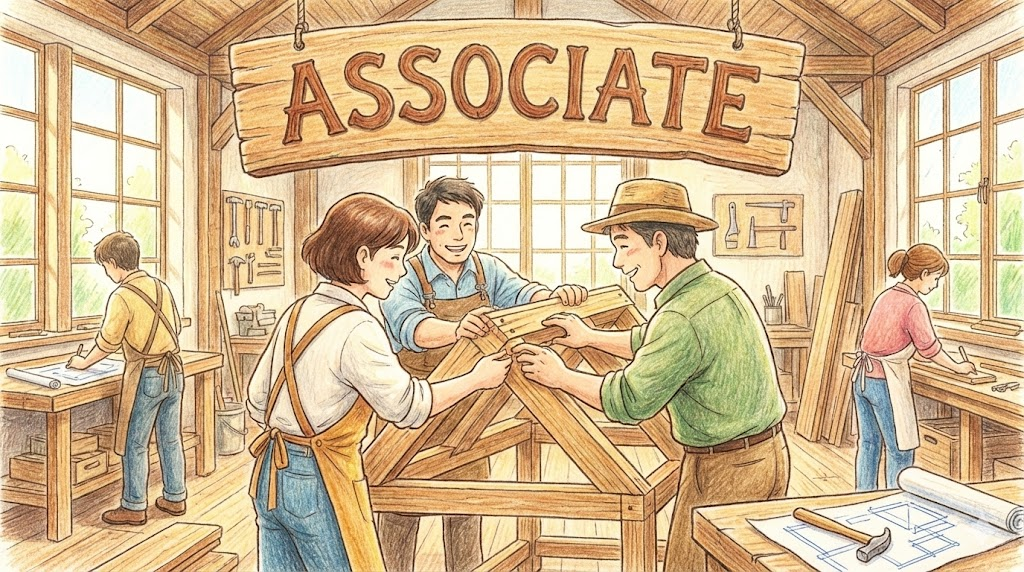 | 라틴어 associare (합치다/동료로 만들다) | "Link together" | 연상하다 (아이디어 연결) → 어울리다 (사람 연결) → 동료/조합원 (연결된 사람) → 준회원/부교수 (완전하진 않지만 연결된 등급) |