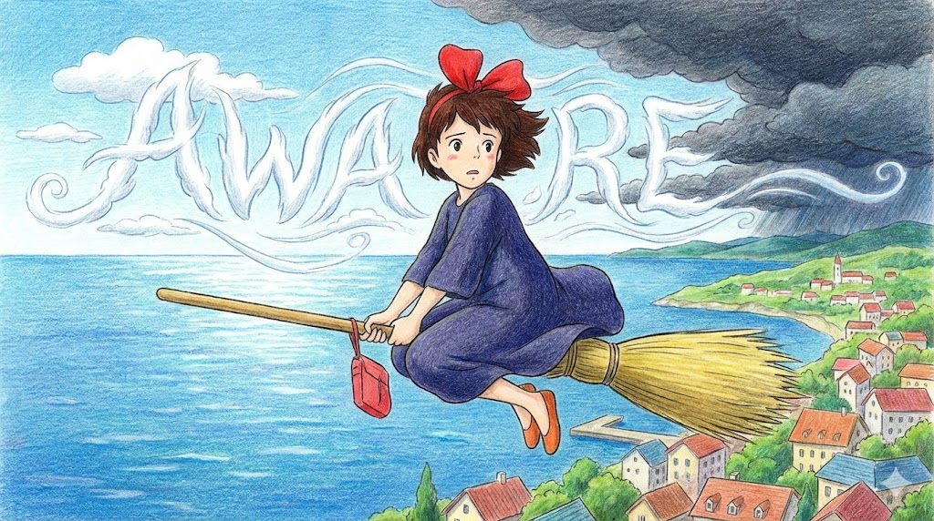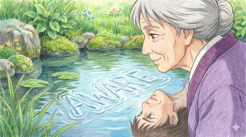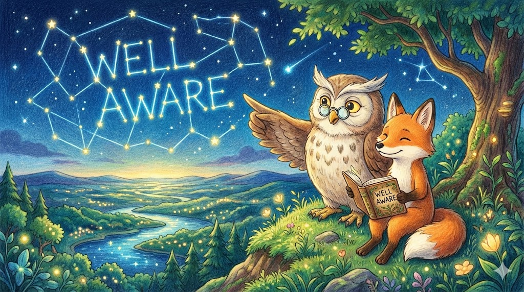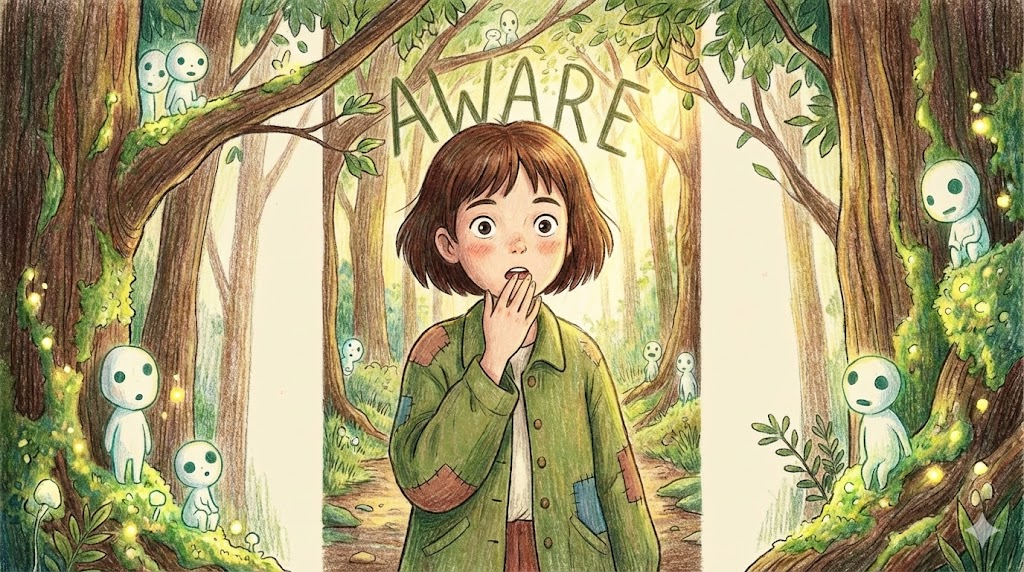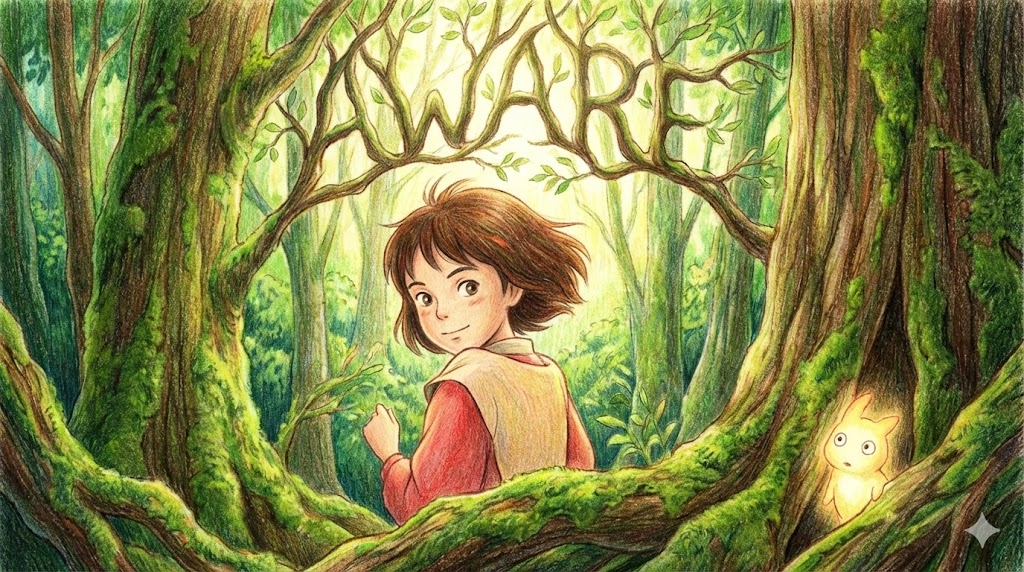 aware는 어둠 속에서 무언가를 발견하고 "거기 있구나!"라고 느끼는 '깨달음의 눈' 이자, 세상의 문제에 눈을 뜨는 '깨어 있는 의식' 입니다.