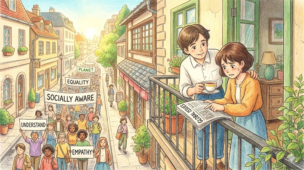 socially / environmentally aware는 사회 문제나 환경 이슈에 깨어 있는 의식을 가진 상태입니다.