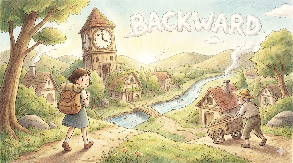 가장 기본적으로는 '등 뒤(Back) 방향으로(Ward)' 움직이는 것입니다. 시간이나 순서를 '거꾸로' 돌릴 때도 쓰지만, 발전하지 못하고 '퇴보하거나 구식인 상태' 를 비판할 때도 씁니다. (예: Backward country = 낙후된 국가). 참고로 미국에서는 'Backward', 영국에서는 'Backwards'를 주로 쓰지만 의미 차이는 없습니다.