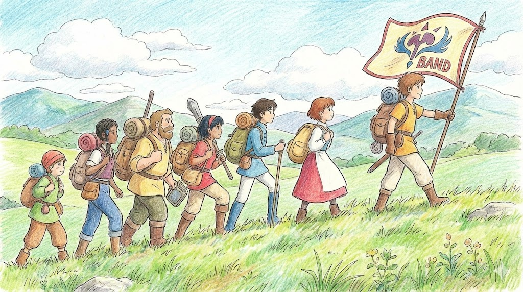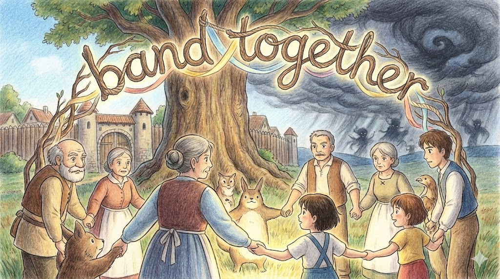 - 사람의 무리: 음악을 하기 위해 뭉친 '밴드' 나, 함께 행동하는 '무리' 입니다. (Band together - 함께 뭉치다/단결하다)