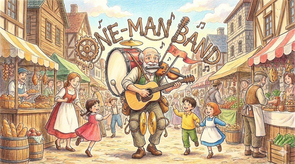 원래는 등에 북 메고, 입에 하모니카 물고, 손으로 기타 치며 혼자서 북 치고 장구 치는 거리의 악사를 말합니다. 비즈니스에서는 직원 없이 사장님이 기획, 영업, 회계, 배달까지 혼자 다 하는 소규모 사업 형태를 비유적으로 이르는 말입니다.