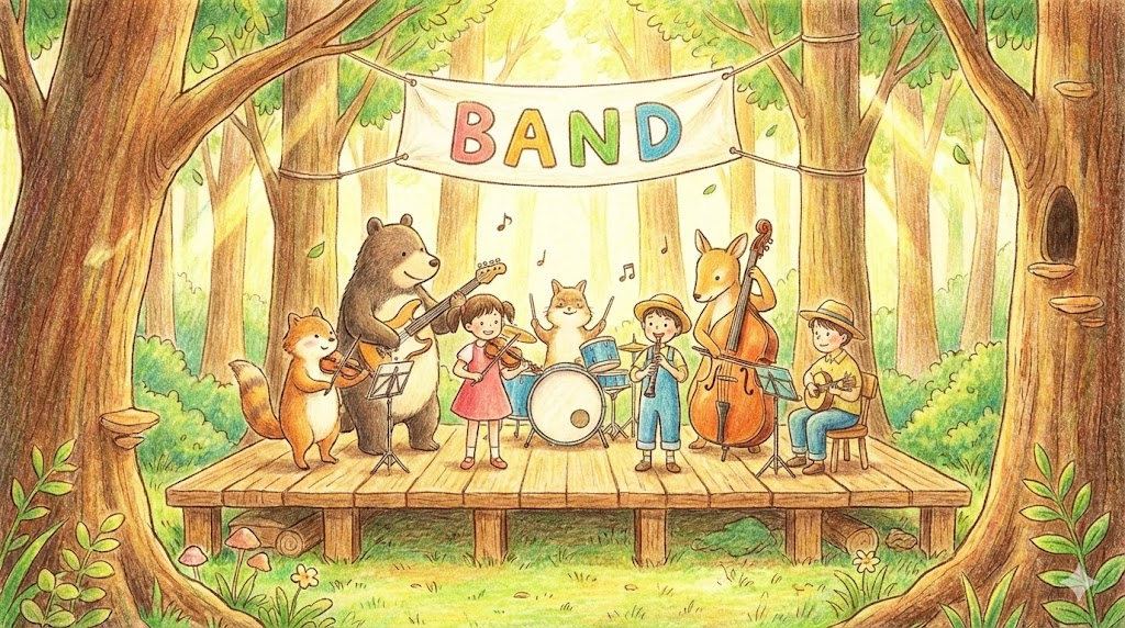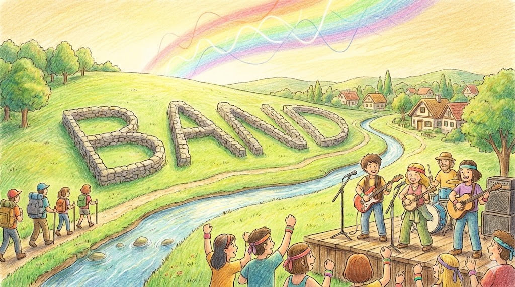 가장 핵심적인 이미지는 '무언가를 묶어주는 띠' 입니다. 머리를 묶는 'Hairband', 손목에 차는 'Wristband'처럼 물리적인 띠를 뜻하기도 하고, 공통된 목적을 위해 끈끈하게 묶인 '사람들의 무리(Group)' 를 뜻하기도 합니다. 음악을 하는 'Rock band'나 도둑의 무리인 'Band of thieves'가 대표적입니다.