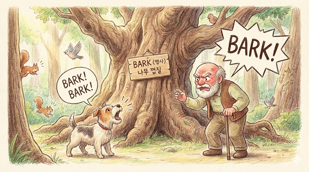 'bark'는 영어 독해에서 문맥 파악이 아주 중요한 다의어(Polysemy) 입니다.