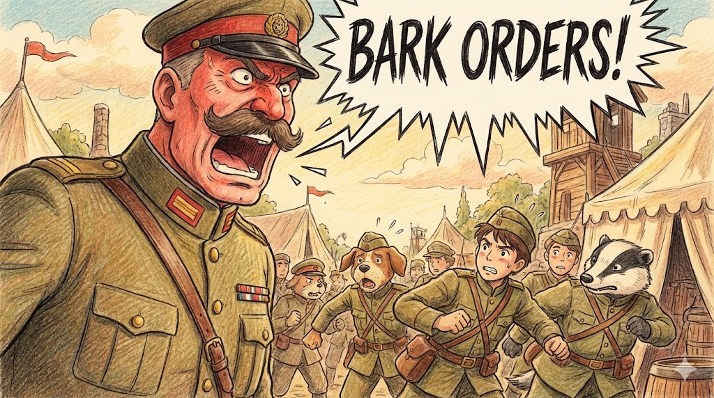 군대의 교관이나 성질 급한 상사가 부하들에게 "이거 해! 저거 해!" 하고 개가 짖듯이(Bark) 날카롭고 크게 소리치는 모습입니다. 부드러운 부탁이 아니라, 상명하복의 강압적인 분위기에서 쓰이는 표현입니다.