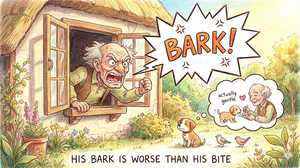 엄청나게 짖어대는 개가 실제로는 물지 않는 경우가 많다는 데서 유래했습니다. 겉으로는 소리를 지르고 화를 내서 무서워 보이지만, 실제 행동(Bite)은 그만큼 가혹하지 않거나 마음이 약한 사람을 묘사할 때 씁니다. 호랑이 선생님이나 츤데레 같은 성격을 설명할 때 딱입니다.