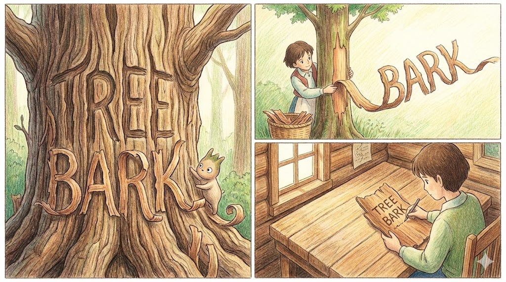 나무의 줄기를 감싸고 있는 가장 바깥쪽 층입니다. 사람으로 치면 피부와 같습니다. 거칠거칠한 질감을 묘사할 때나, 약재나 종이의 원료로 쓰이는 껍질을 말할 때 사용합니다. "Stripping bark(껍질을 벗기다)"라는 표현과 자주 쓰입니다.