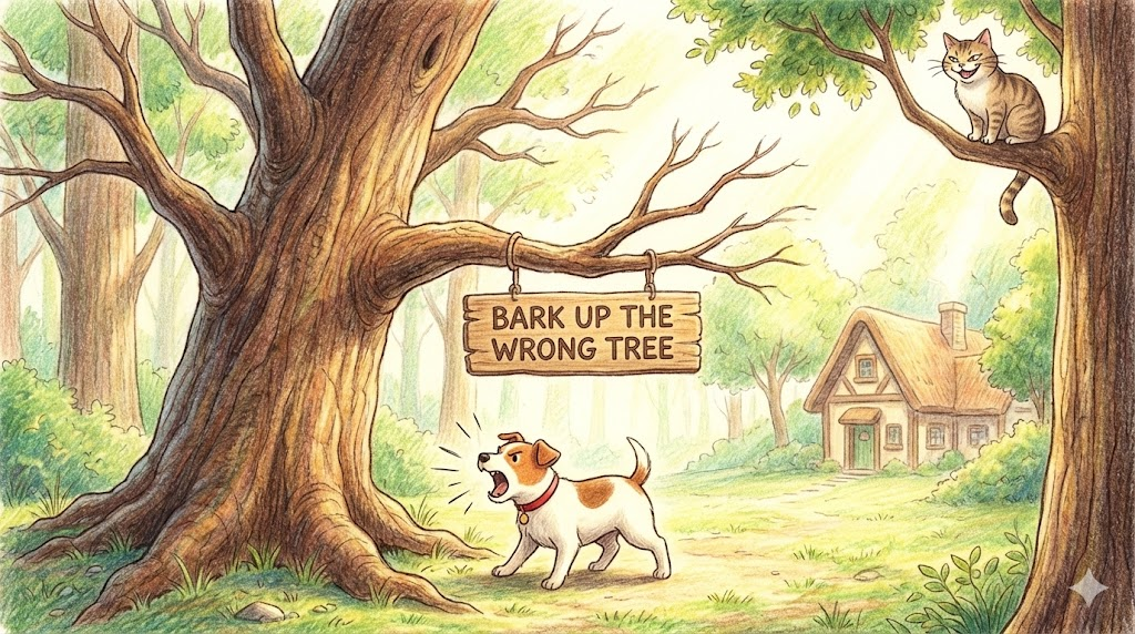 bark up the wrong tree는 사냥개들이 고양이가 도망간 나무가 아닌 엉뚱한 나무를 보고 짖는 모습에서 유래하여, '엉뚱한 사람을 비난하다' 또는 '헛다리 짚다(잘못된 목표를 좇다)' 라는 아주 유명한 관용구입니다.