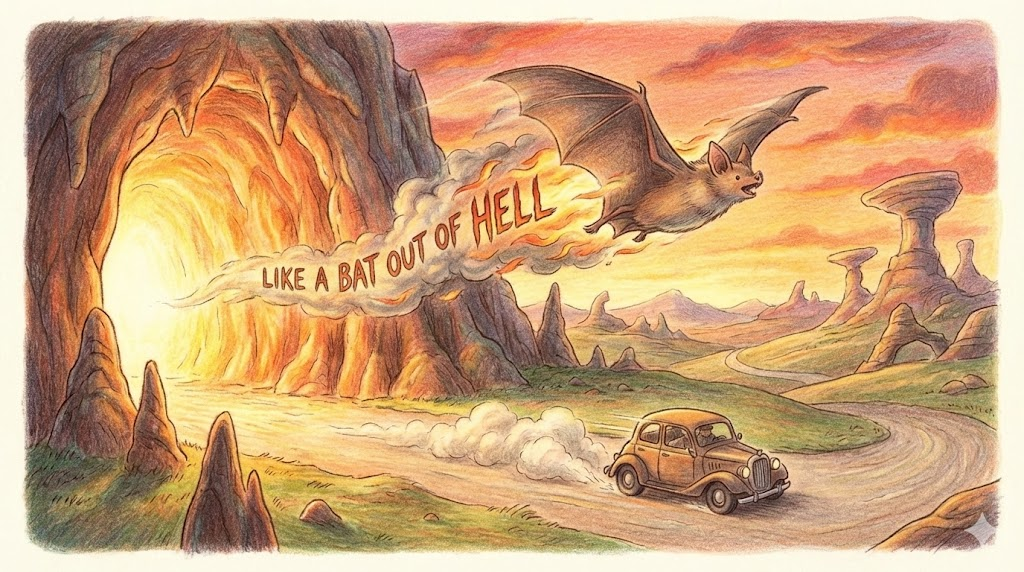 - 해석: 지옥에서 탈출하는 박쥐처럼 엄청나게 빠르고 급하게 움직이는 모습을 묘사하는 다소 거친 표현입니다.